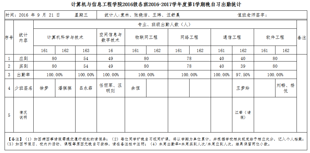 9月21日大一晚自习出勤情况通报