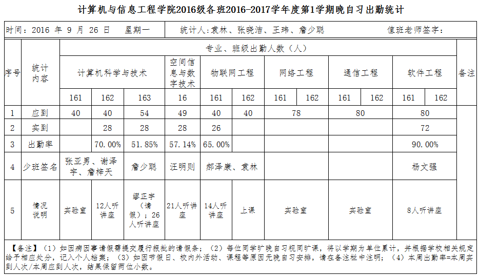 9月26日大一晚自习出勤情况通报