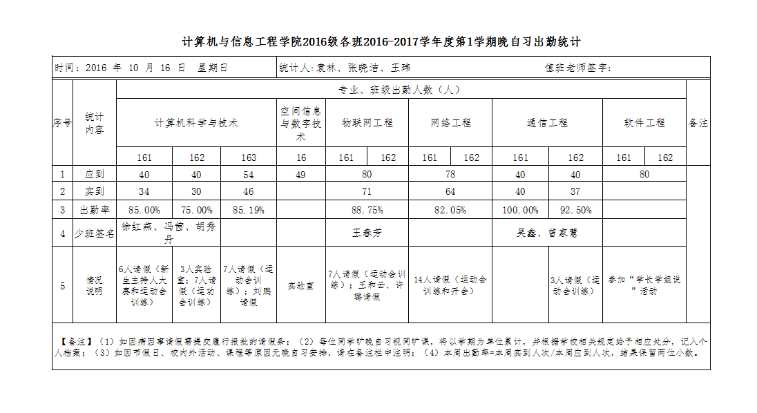 10月16日大一晚自习出勤情况通报