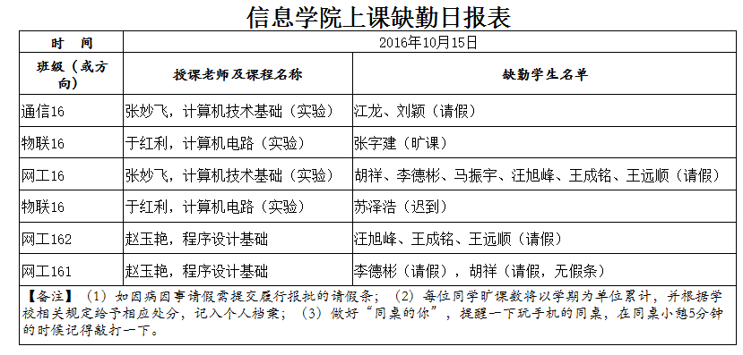 10月15日学生上课缺勤情况通报
