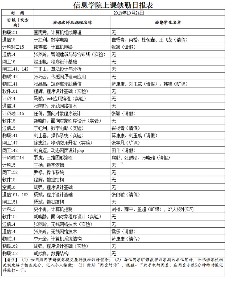 10月24日学生上课缺勤情况通报