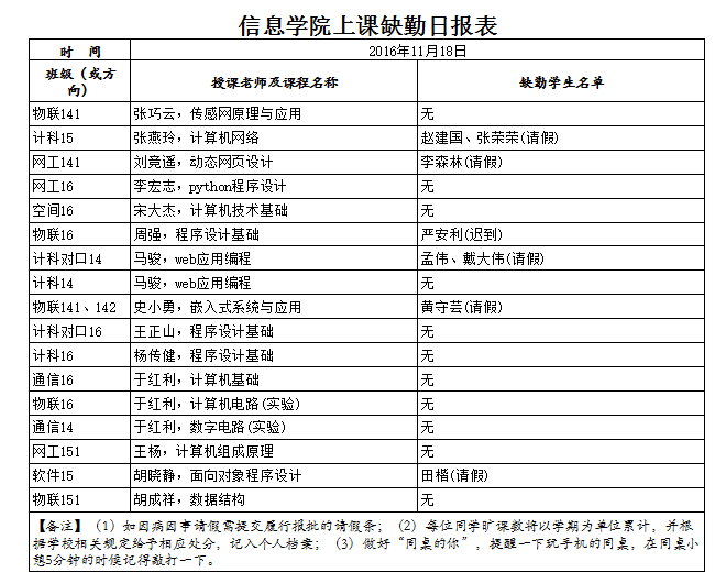 11月18日学生上课缺勤情况通报