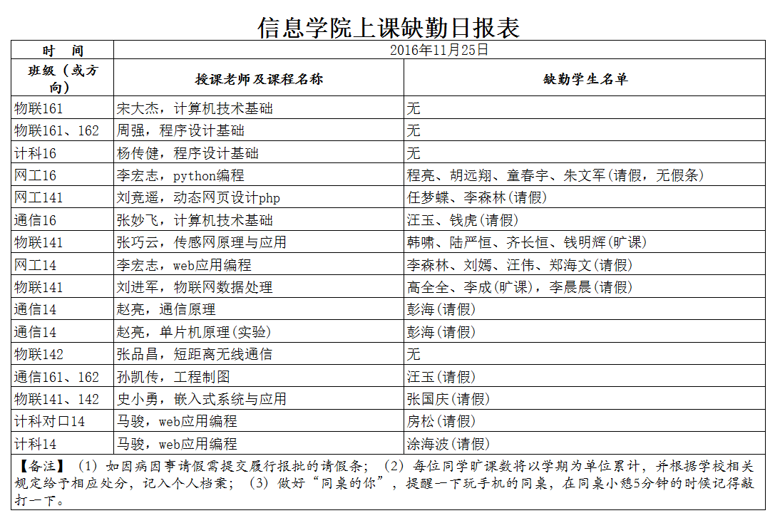 11月25日学生上课缺勤情况通报