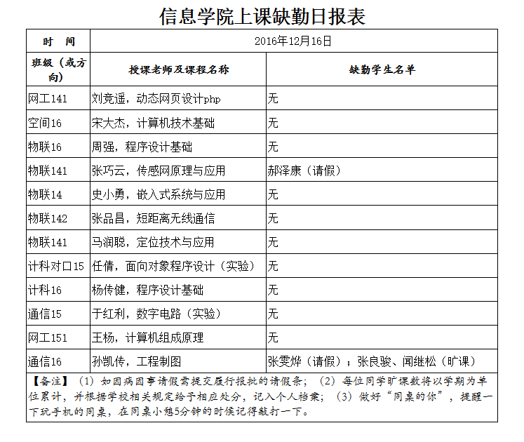 12月16日学生上课缺勤情况通报