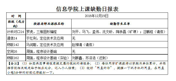 12月19日学生上课缺勤情况通报
