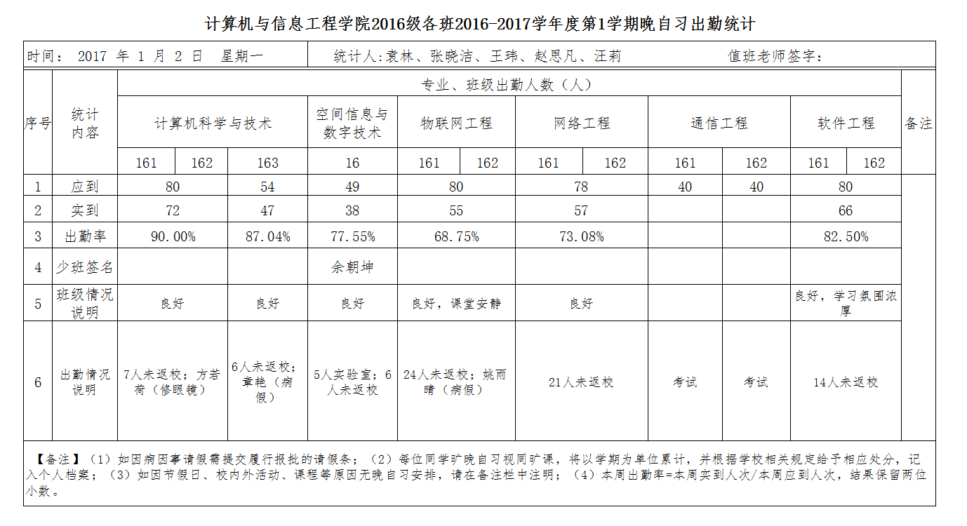 1月2日大一晚自习出勤情况通报