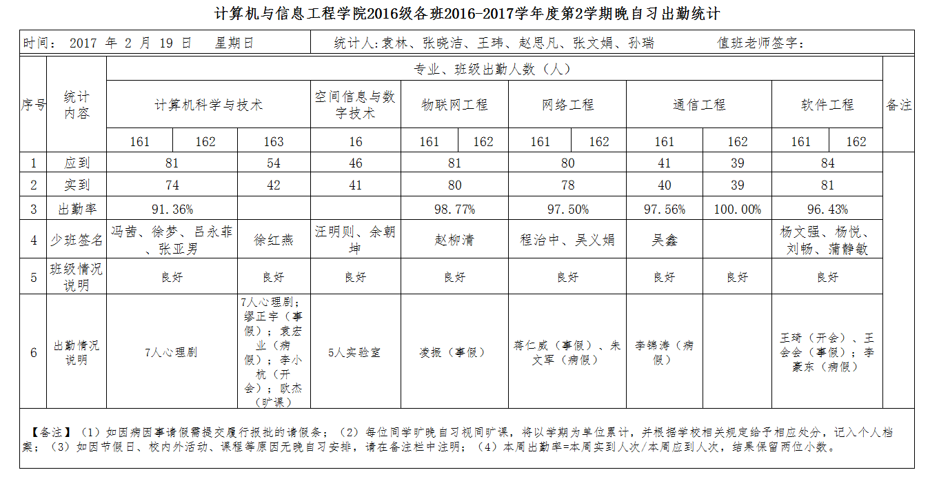 2月19日大一晚自习出勤情况通报