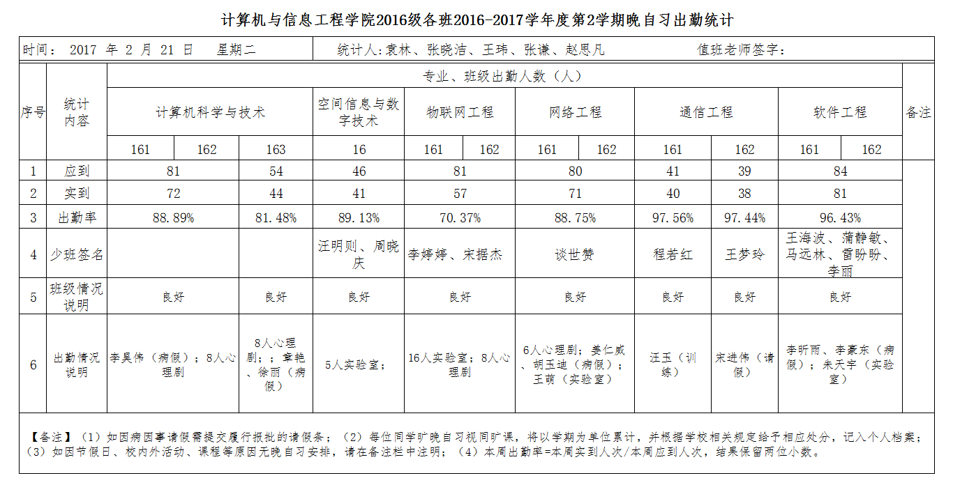 2月21日大一晚自习出勤情况通报