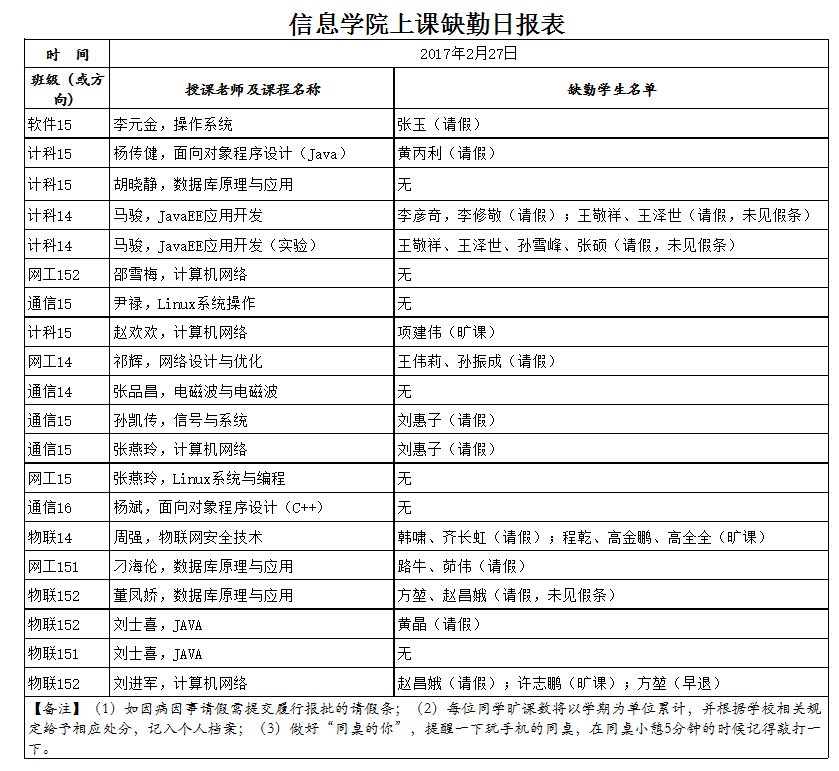 2月27日学生上课缺勤情况通报