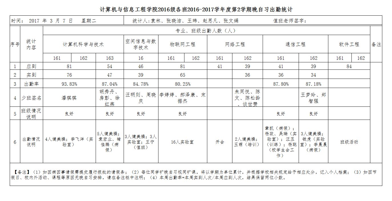 3月7日大一晚自习出勤情况通报