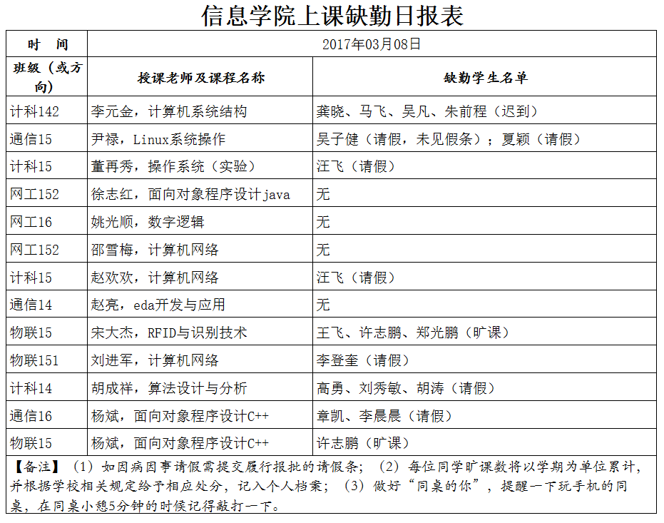 3月8日学生上课缺勤情况通报