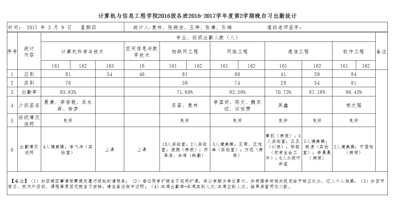 3月9日大一晚自习出勤情况通报