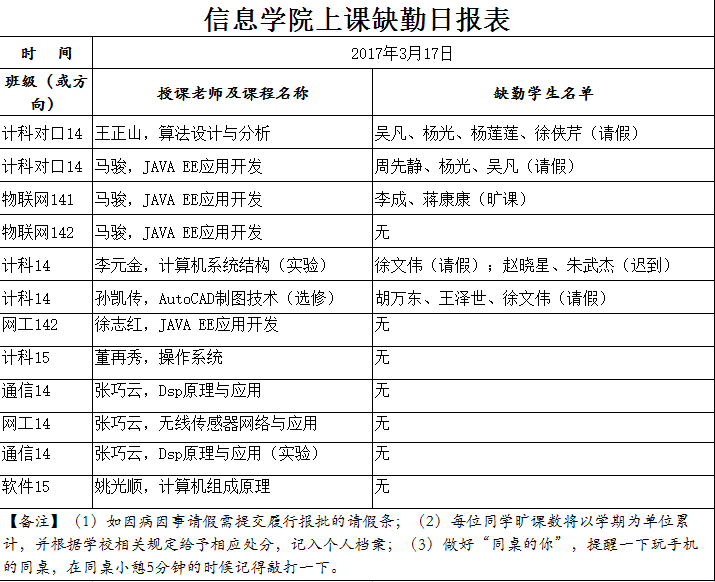 3月17日学生上课缺勤情况通报