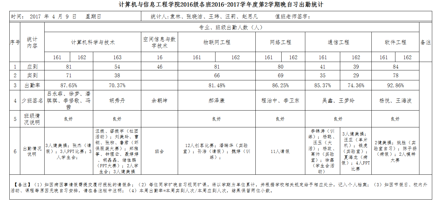 4月9日大一晚自习出勤情况通报