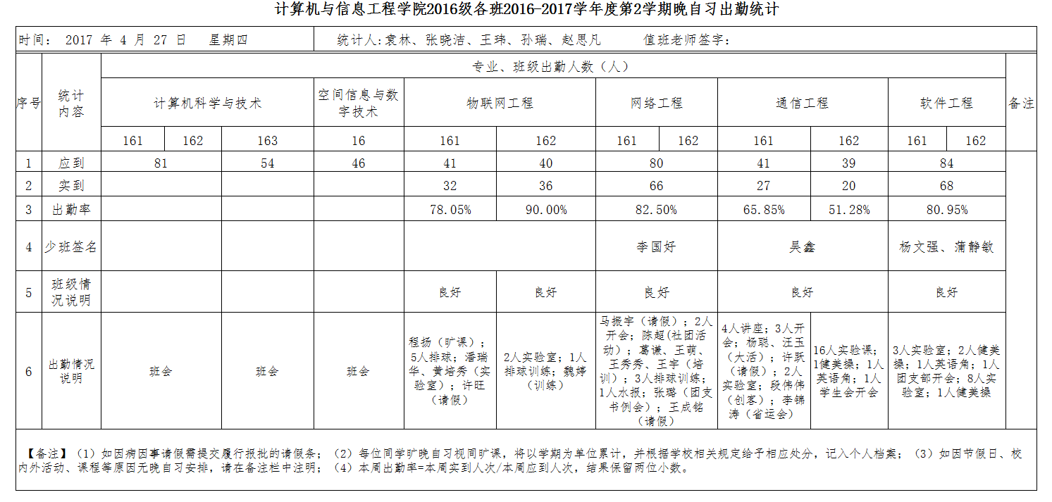 4月27日大一晚自习出勤情况通报