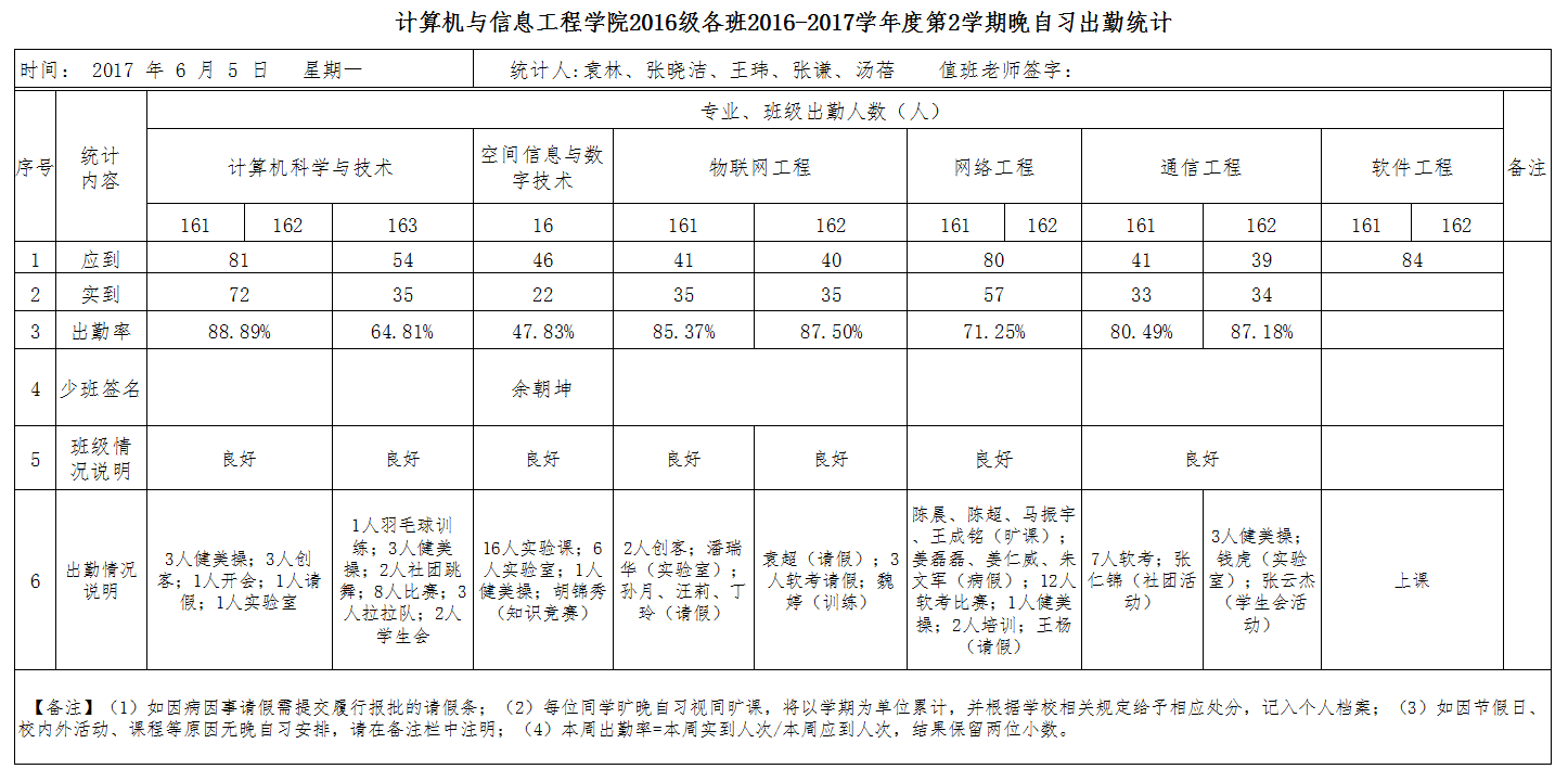 6月5日大一晚自习出勤情况通报