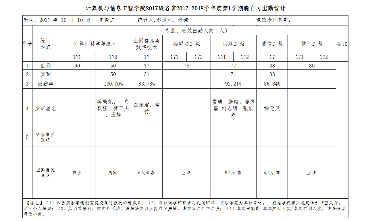 10月10日大一晚自习出勤情况通报