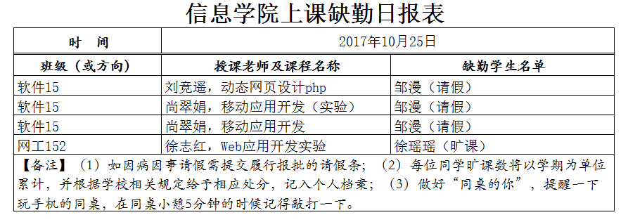 10月25日学生上课缺勤情况通报
