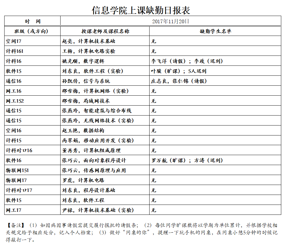 11月20日学生上课缺勤情况通报