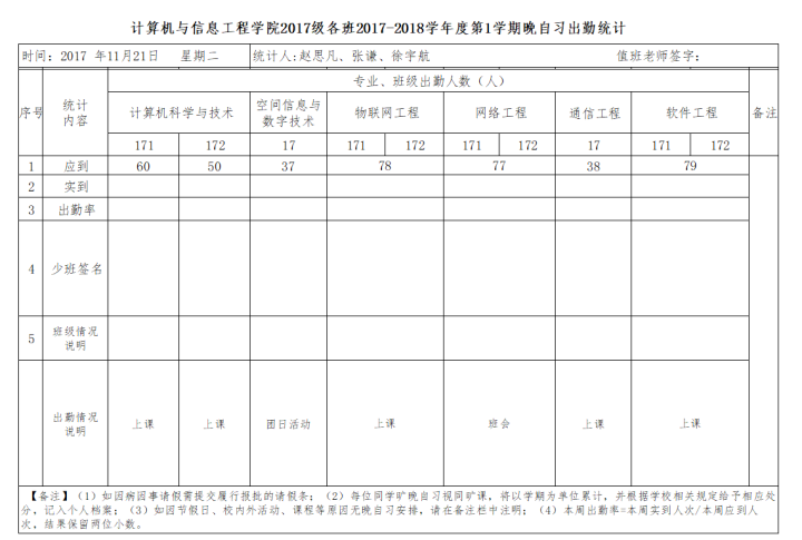 11月21日大一晚自习出勤情况通报