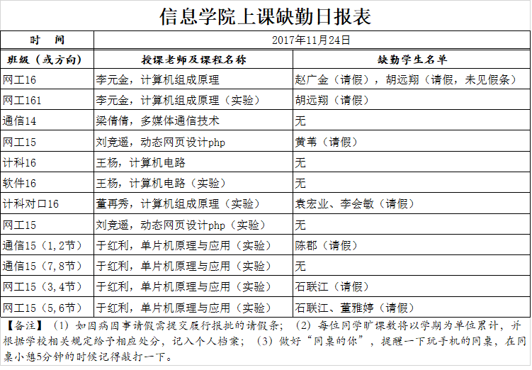 11月24日学生上课缺勤情况通报