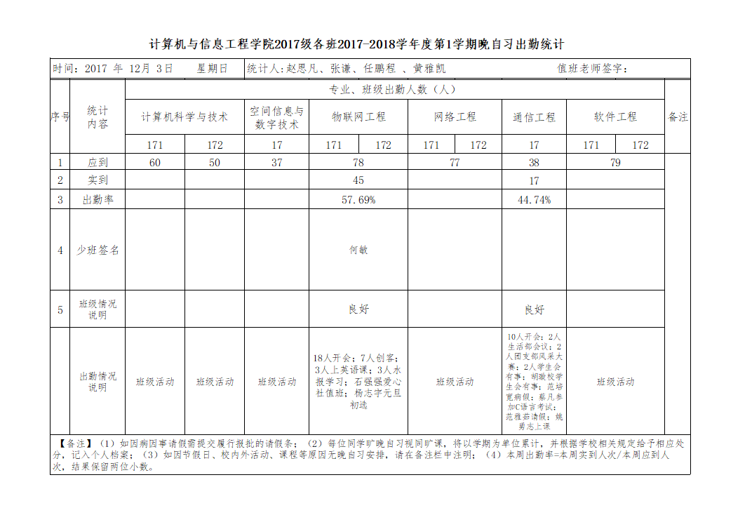 12月3日大一晚自习出勤情况通报