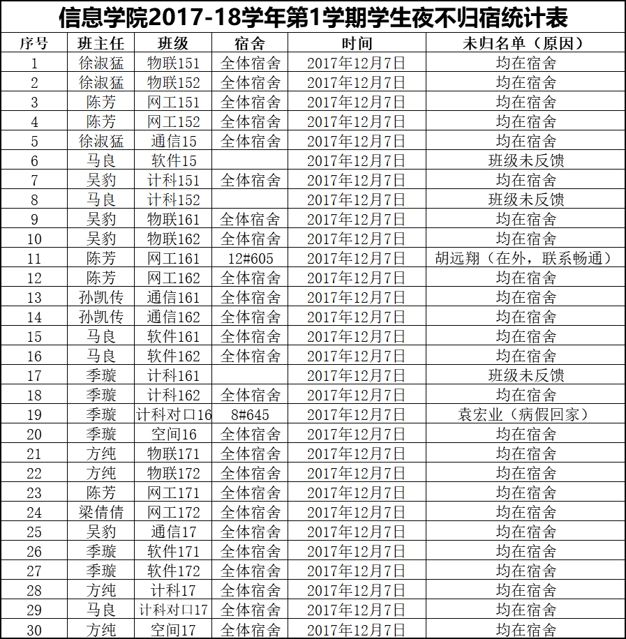 12月7日学生夜不归宿情况通报