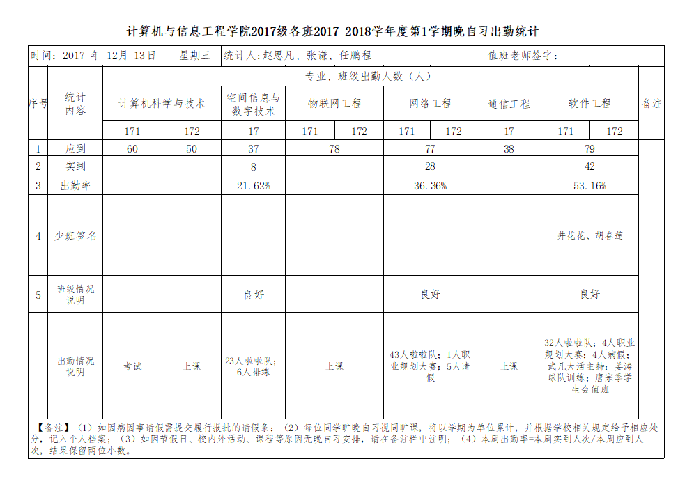 12月13日大一晚自习出勤情况通报