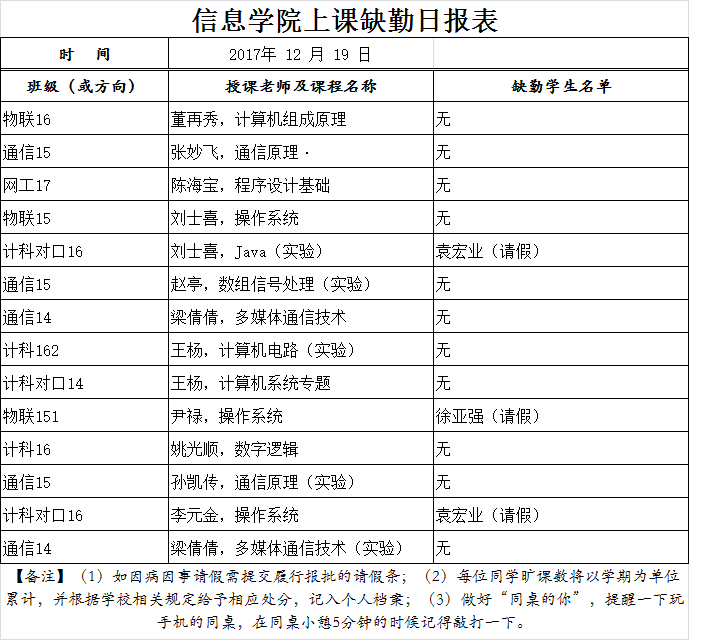 12月19日学生上课缺勤情况通报