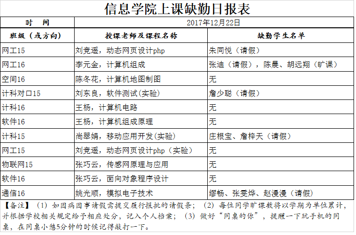 12月22日学生上课缺勤情况通报