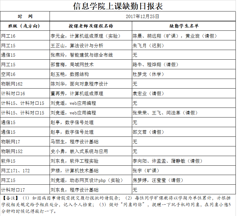 12月25日学生上课缺勤情况通报