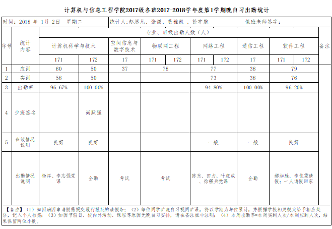 1月2日大一晚自习出勤情况通报