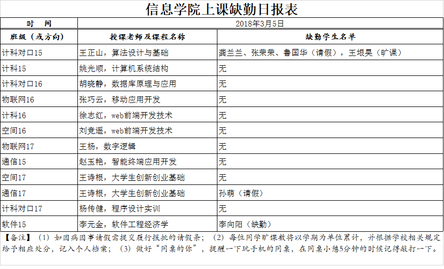 3月5日学生上课缺勤情况通报