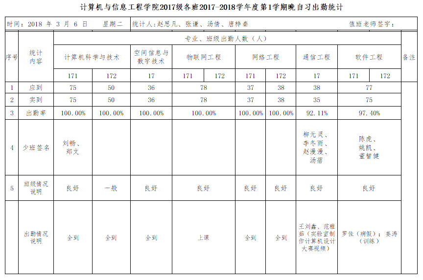 3月6日大一晚自习出勤情况通报