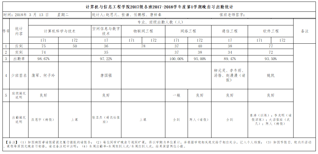 3月13日大一晚自习出勤情况通报