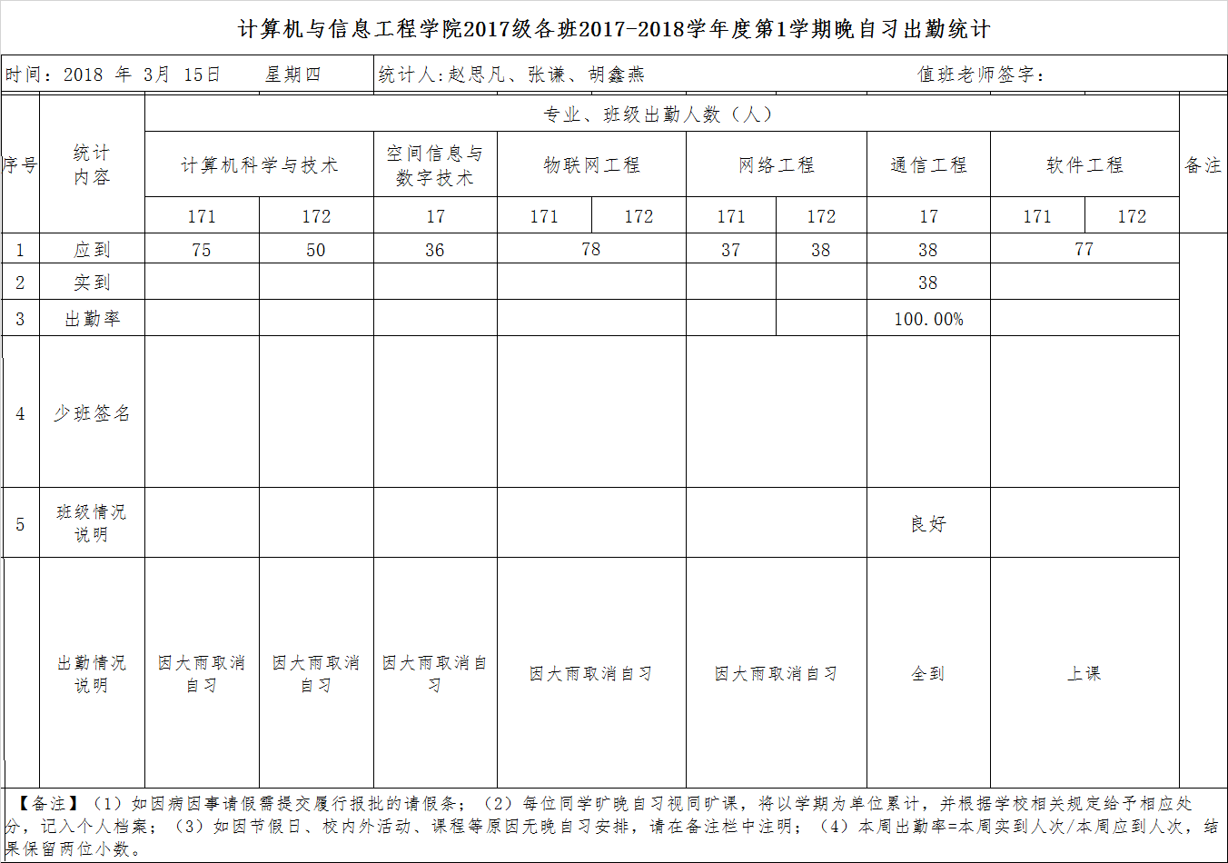 3月15日大一晚自习出勤情况通报