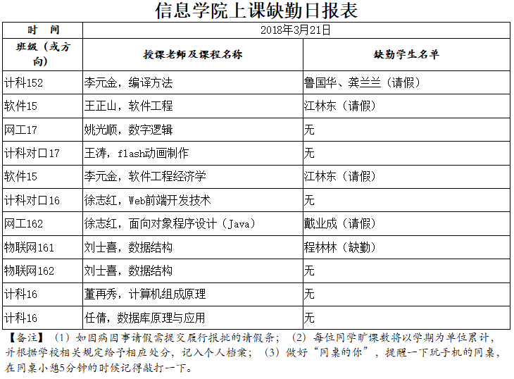 3月21日学生上课缺勤情况通报