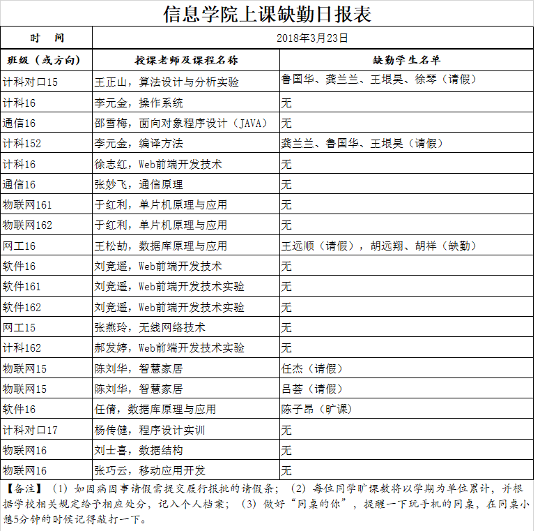 3月23日学生上课缺勤情况通报