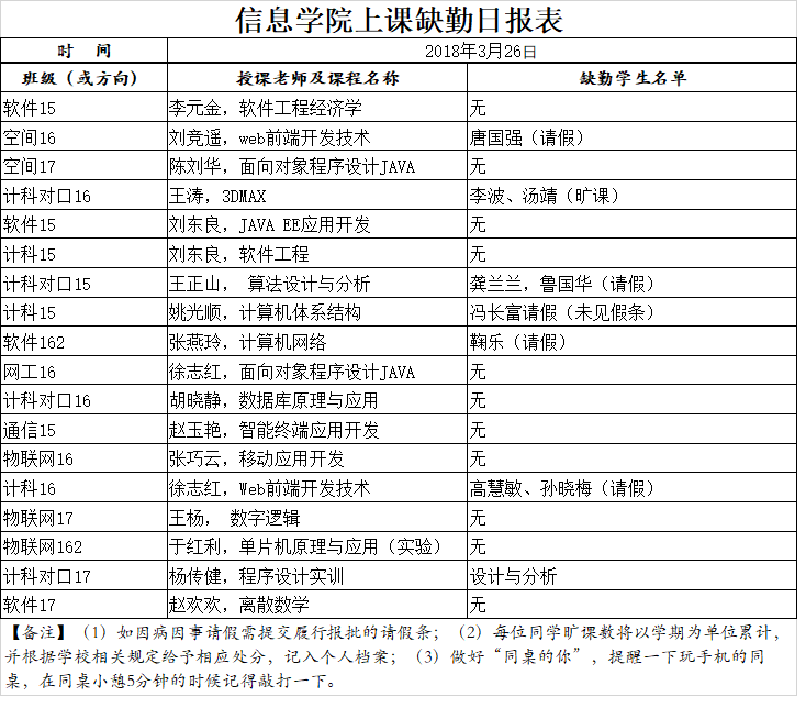 3月26日学生上课缺勤情况通报