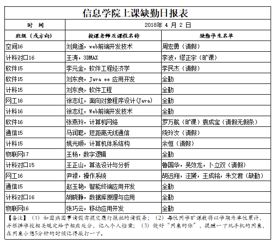 4月2日学生上课缺勤情况通报