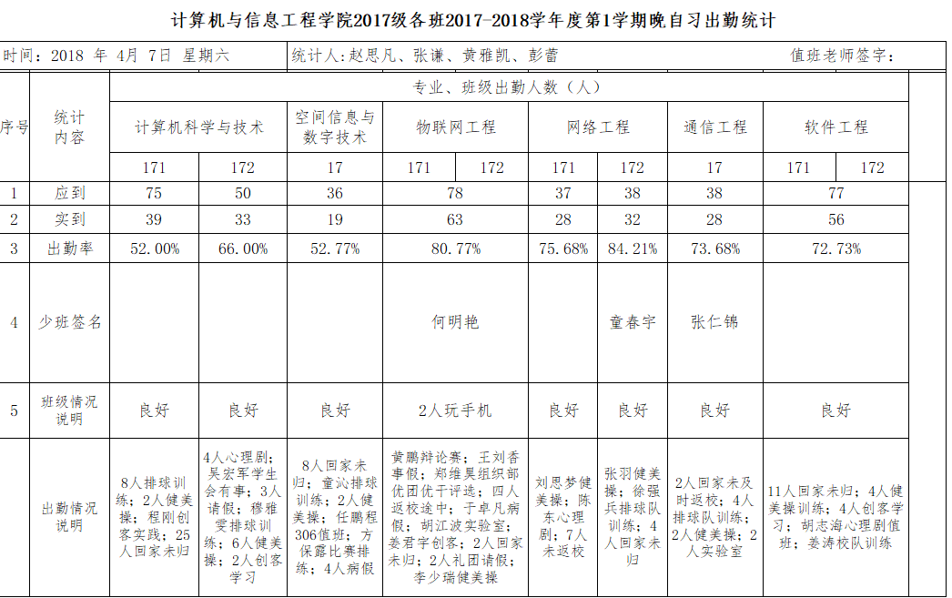 4月7日大一晚自习出勤情况通报