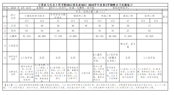 4月15日大一晚自习出勤情况通报