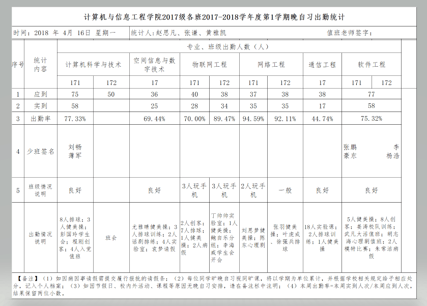 4月16日大一晚自习出勤情况通报