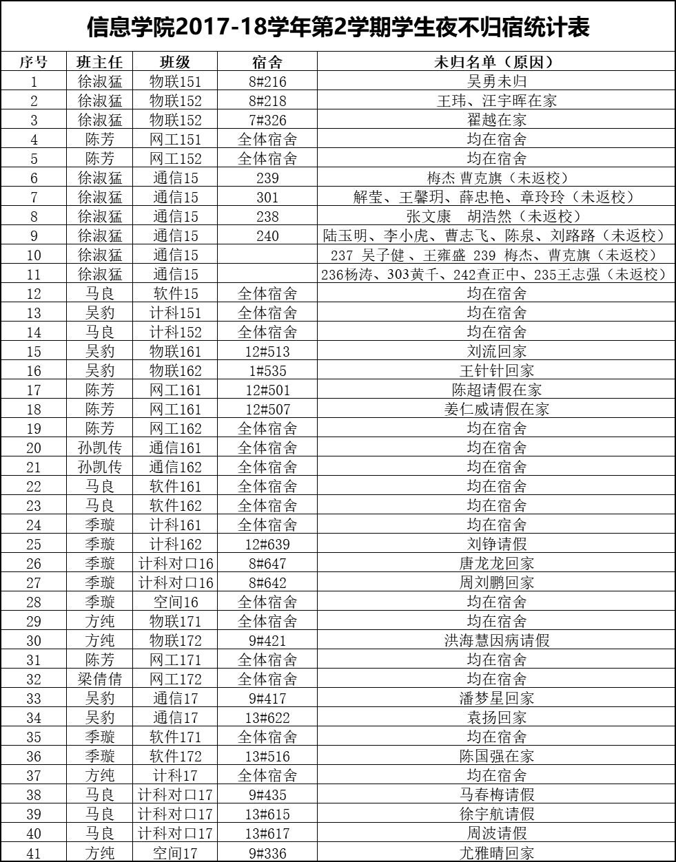 5月1日学生夜不归宿情况通报