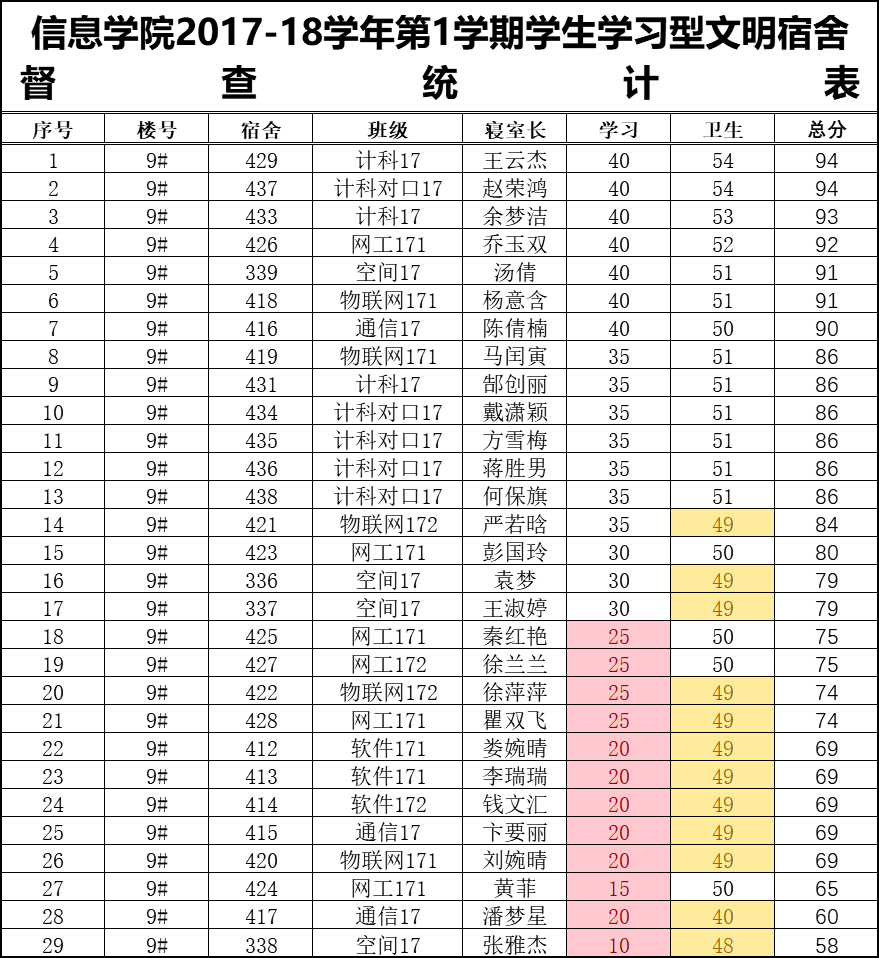 11周1次学习型文明宿舍检查情况通报