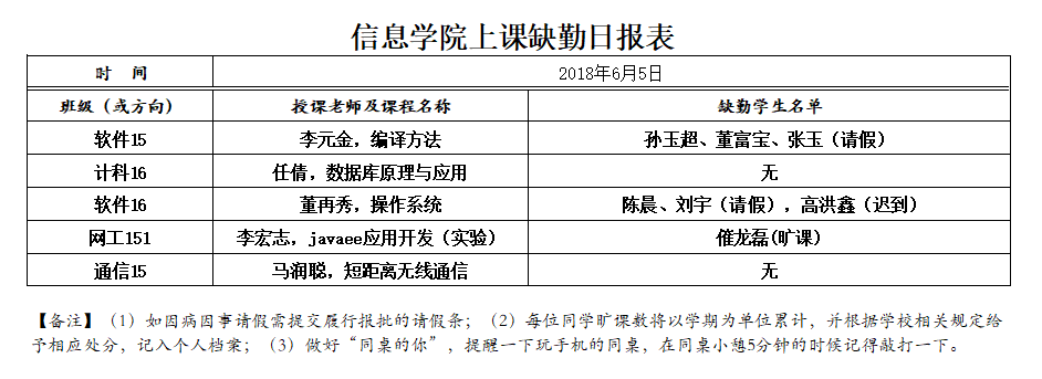6月5日上课缺勤情况通报