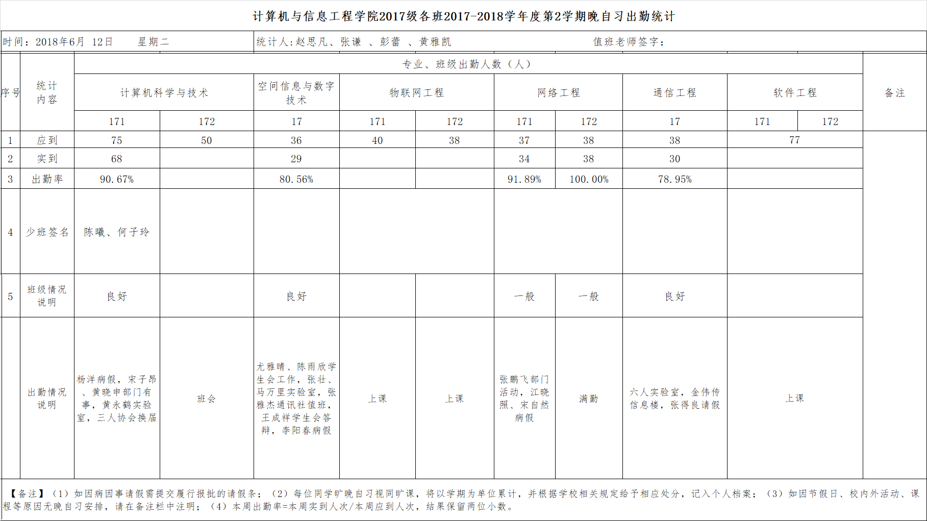 6月12日大一晚自习出勤情况通报
