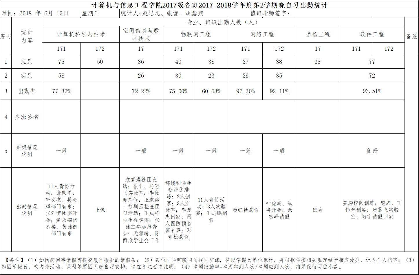 6月13日大一晚自习出勤情况通报