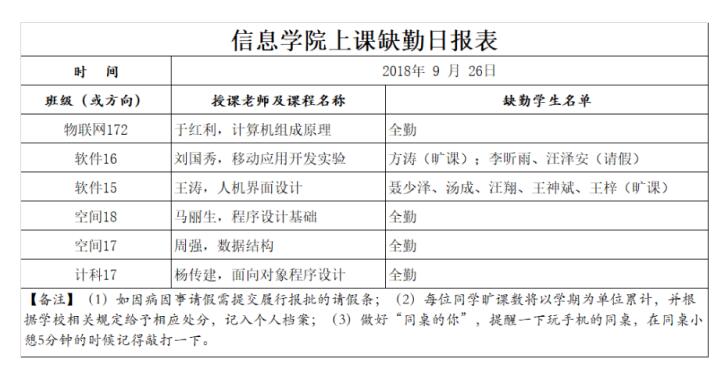 9月26日上课缺勤情况通报