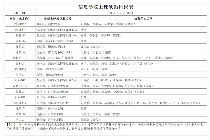 9月29日上课缺勤情况通报